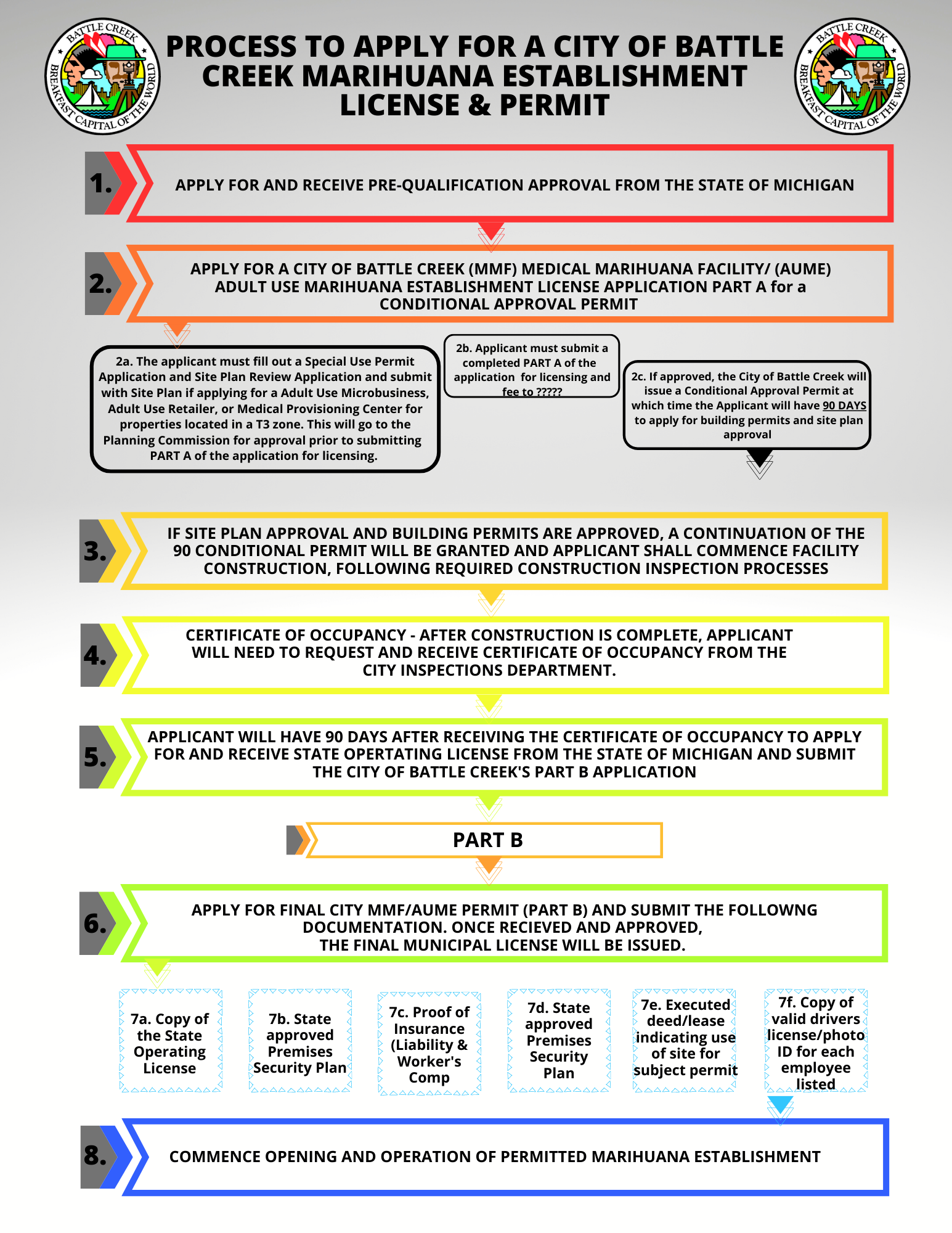 - The applicant has 90 days after the certificate of occupancy is issued to obtain the final state license and submit the City of Battle Creek Part B application and supporting documents.
